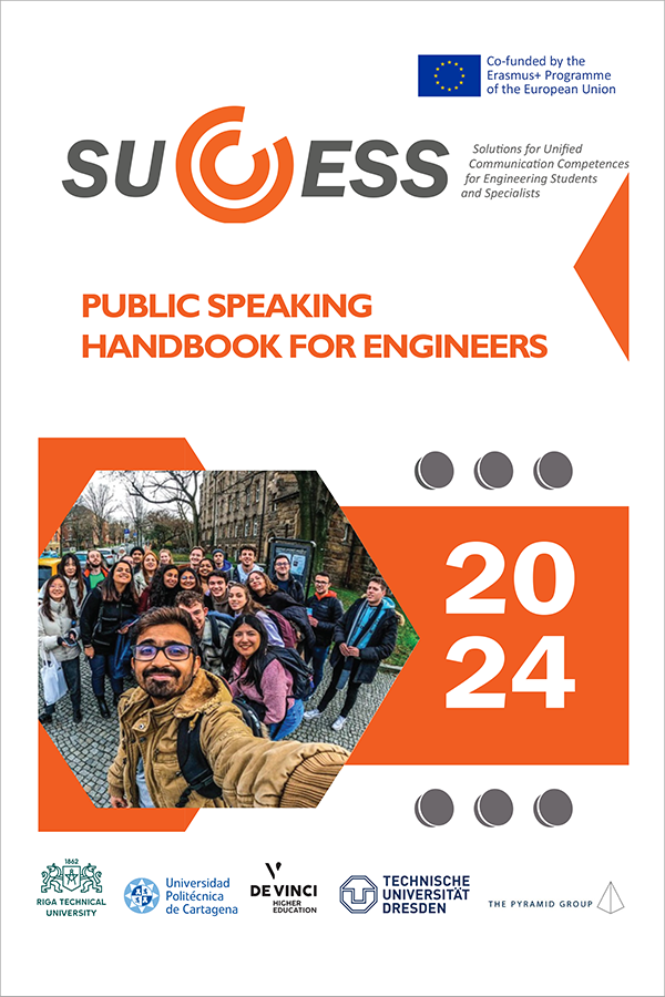The Public Speaking Handbook for Engineers was created as part of the ISFSCU project SUCCESS (Solutions for Unified Communication Competences for Engineering Students and Specialists). The information compiled in the handbook will be a valuable resource for anyone who wants to improve their presentation skills and present more effectively in front of an audience. The tips and recommendations will help you better understand how to prepare and confidently deliver your message to listeners. The conclusion also includes a self-assessment and the main points of the preparation phase to focus on.